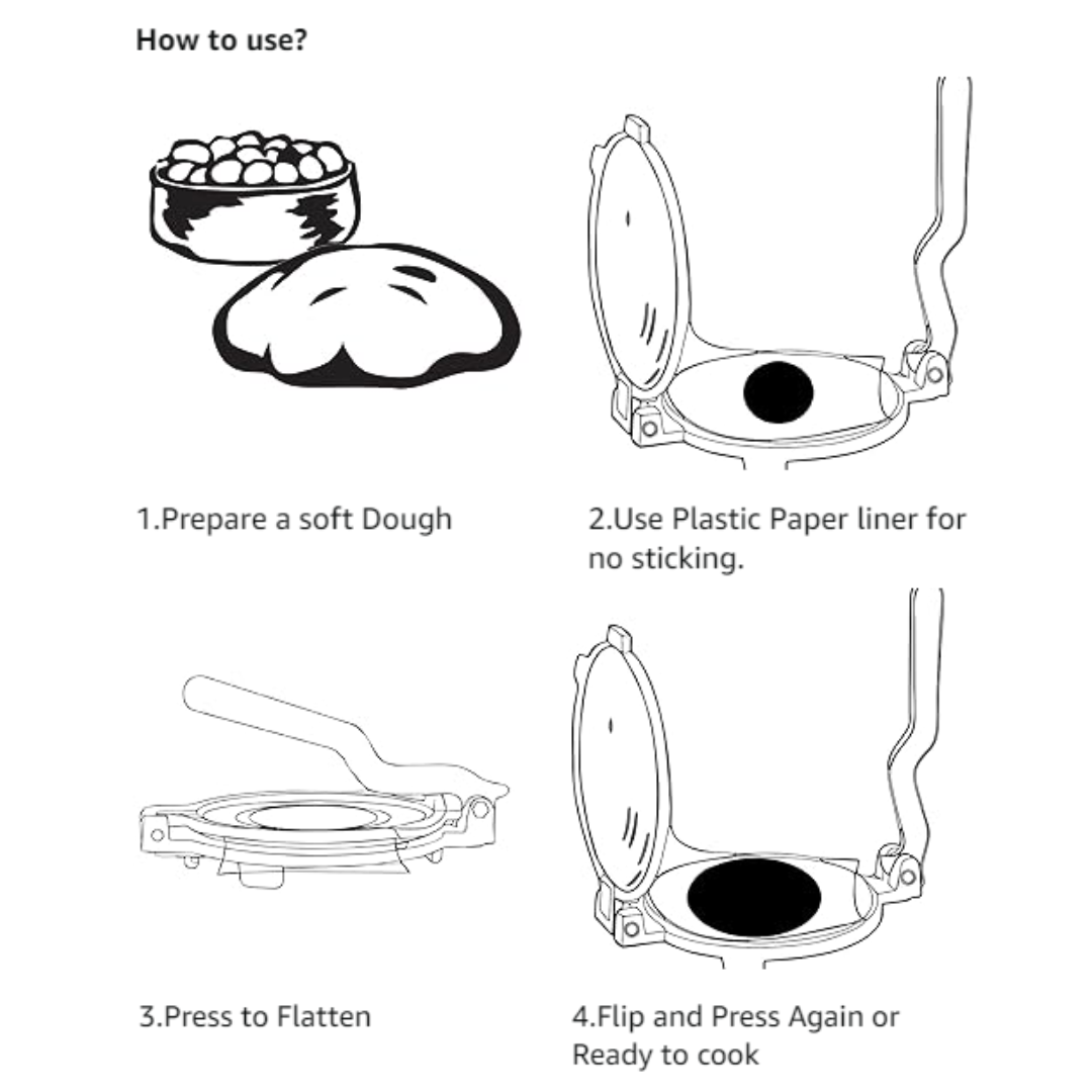 A roti press typically consists of two plates or surfaces that are pressed together to cook the dough evenly. You place a ball of dough between the plates, close the press, and apply pressure to flatten and cook the roti. The plates help in pressing the roti, while the pressure ensures that it remains flat and uniform in thickness.