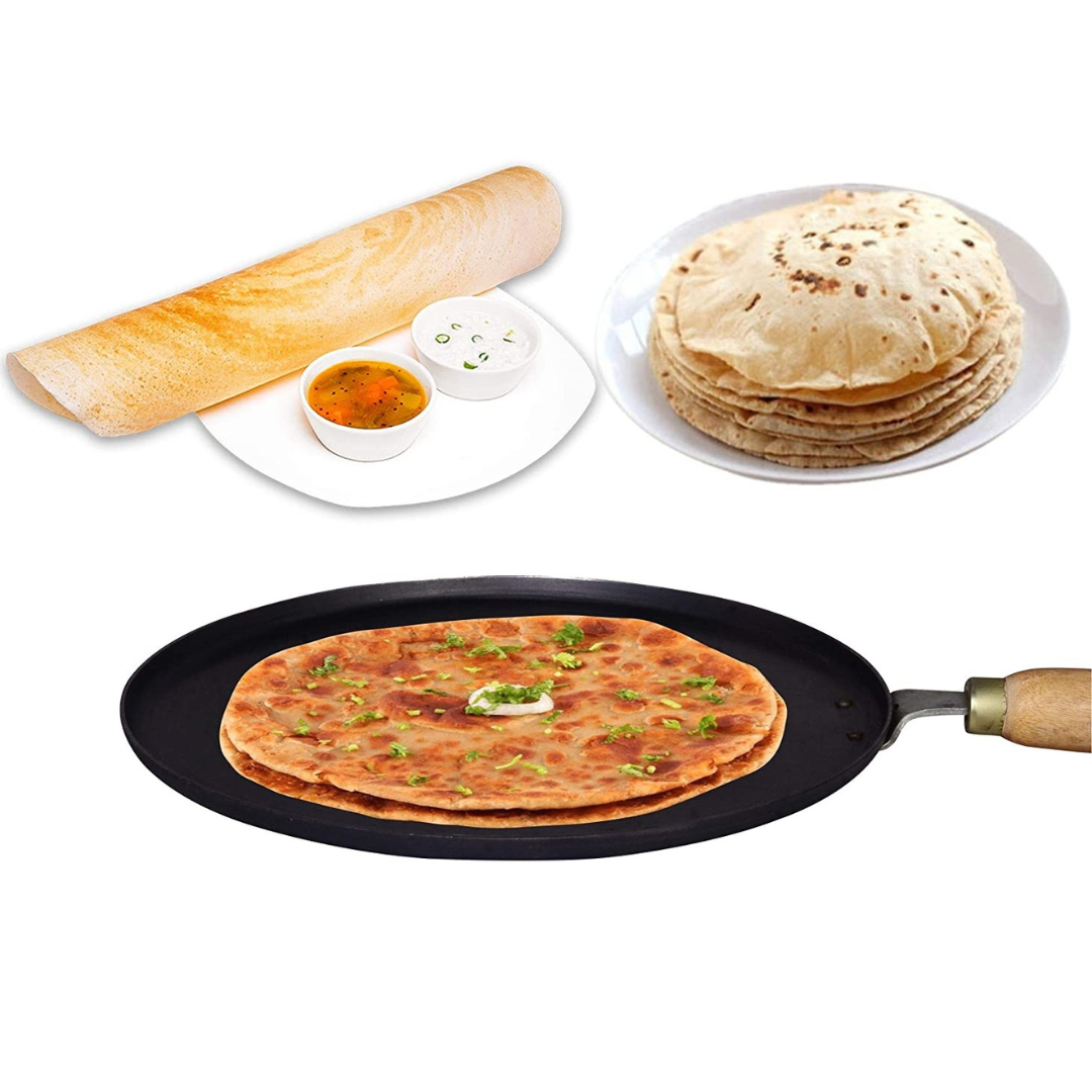 Traditional Concave Shaped Iron Tawa for Roti / Chapathi / Paratha / Fulka with Wooden Handle (11 Inch)